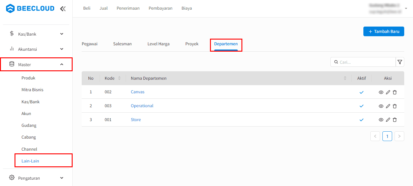 Melihat daftar master departemen melalui menu [Master] > [Lain-lain] > Tab |Departemen| (Baca Juga : Membuat Master Departemen Beecloud 3.0)