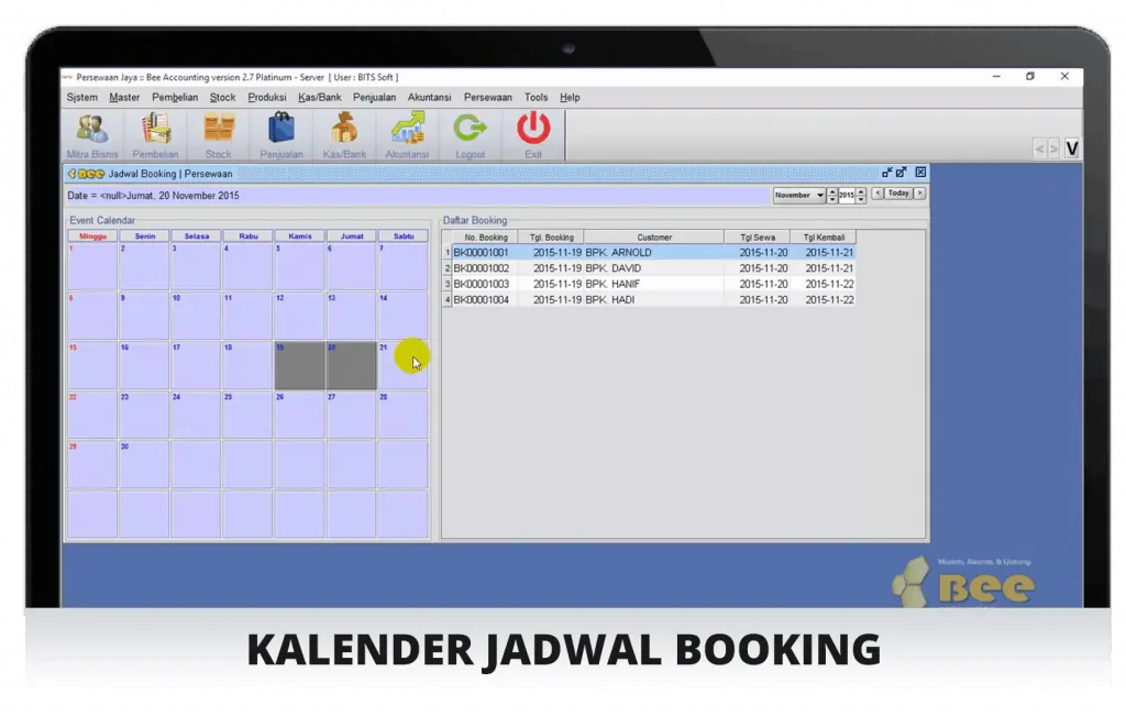 Tampilan Laptop Kalender Booking Aplikasi Rental Beeaccounting (Sumber: Bee.id)
