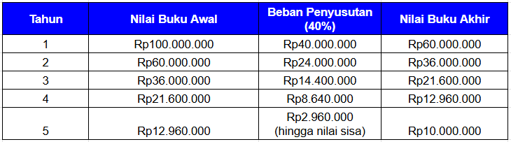 Jumlah persentase tersebut yaitu dua kali lipat dari persentase pada tarif penyusutan yang menggunakan metode garis lurus. Dalam perhitungannya metode yang satu ini dihitung dengan cara mengalikan persentase, atau bisa juga dengan menggunakan tarif tertentu yang ada di nilai buku dari suatu aset.