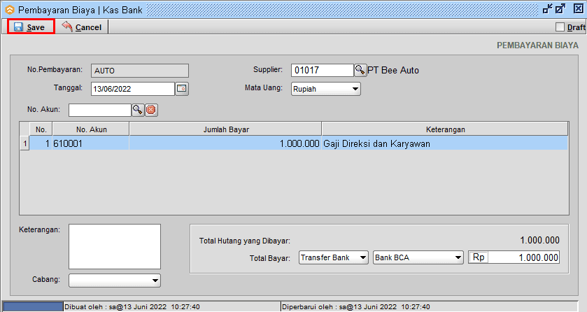 Setelah itu klik [Save] untuk menyimpan data, secara otomatis kas/bank Anda akan berkurang karena digunakan untuk membayar biaya gaji karyawan.