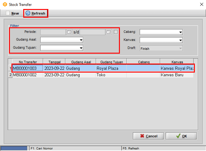 5. Hilangkan semua filter supaya memudahkan pencarian Master Kanvas / No. Transfer yang akan dipilih > klik |Refresh| > lalu pilih Kanvas / No. Transfer nya dengan klik 2x