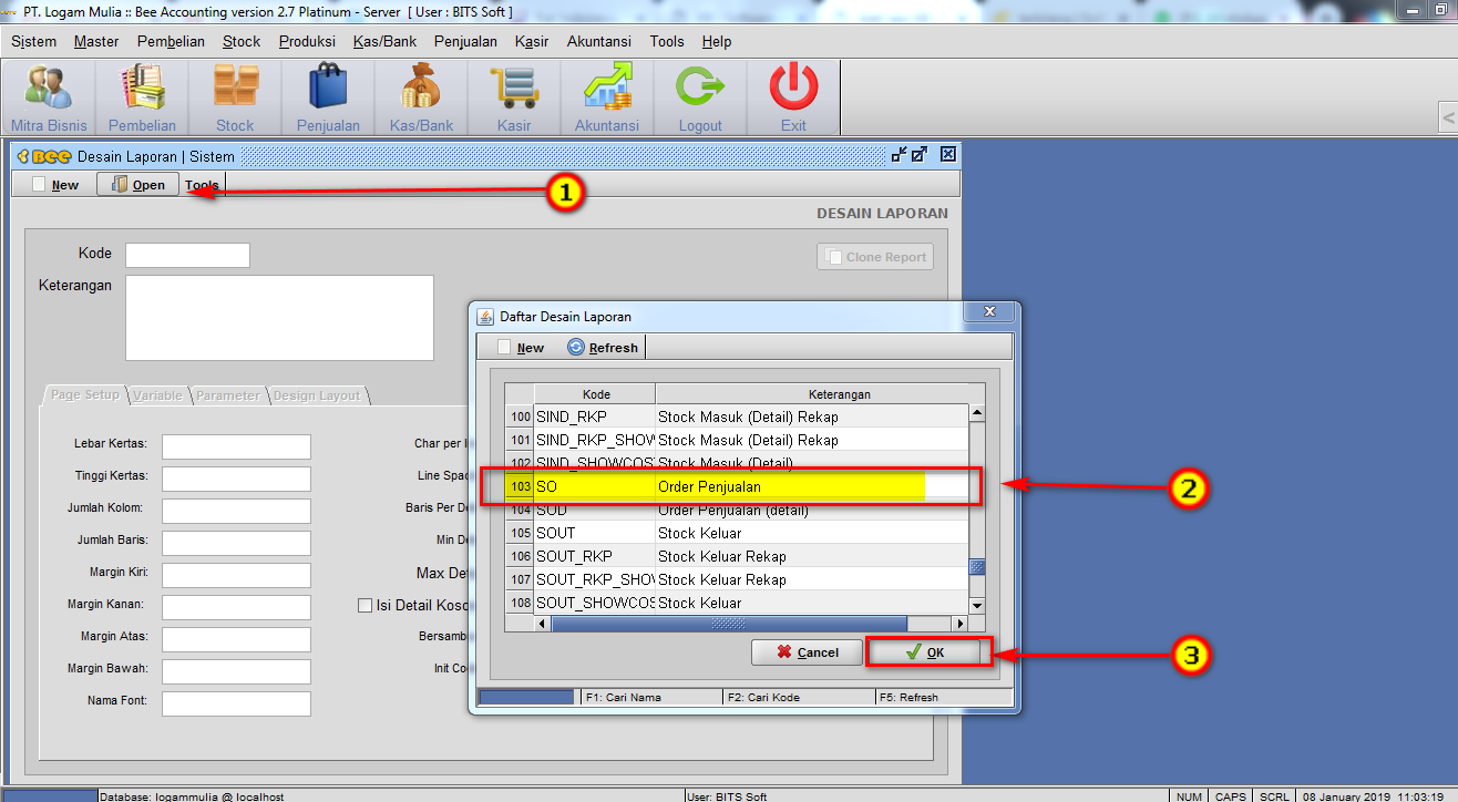 - Lalu pilih Open pada form desain laporan , nanti akan tampil daftar desain laporan, pilih kode SO (Order Penjualan) kemudian pilih OK