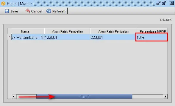 Selanjutnya anda Scroll halaman master pajak ke kanan hingga anda menemukan kolom Presentase NPWP, klik 2x nilai pada kolom Presentase NPWP.