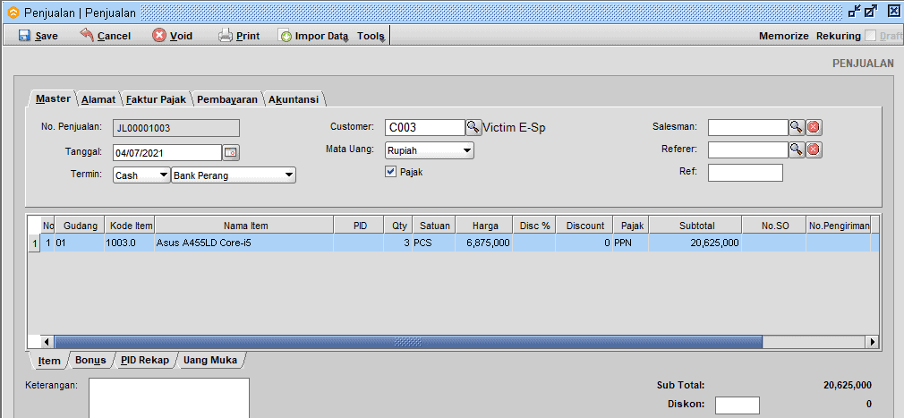 2. Lalu lakukan transaksi dan gunakan akun bank yang telah kita setting sebelumya di master kas / bank ( disini saya contohkan transaksi penjualan ).