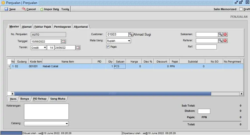 Dengan kejadian diatas kita dapat mengambil kesimulang Customer Ahmad Sugiyanto masuk pada Level Harga Partai Kecil, sedangkan pada Item Nabati Coklat Level Harga Partai Kecil berisi 0. Alhasil ketika melakukan Penjualan otomatis tampil Harga 0. Pastikan pemilihan Level Harga Customer dan Pengisian Harga Jual Item sudah sesuai.