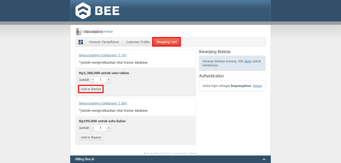 Isi jumlah pembelian lisensi web report Beeaccounting, jika sudah klik |Add to Basket|