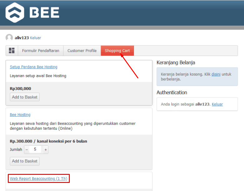 Klik Tab [Shopping Cart], lalu klik Web Report Beeaccounting (1 Th)