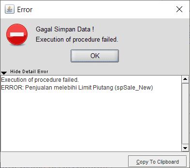 Dengan setting ini kita dapat melakukan pembatasan atau limit piutang customer, ketika nilai piutang atau jumlah nota piutang lebih dari limit yang ditentukan maka data penjualan tidak bisa tersimpan dengan keterangan error berikut :