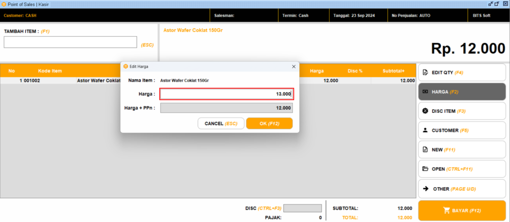 - Pada contoh harga awal item senilai 12.000 > dirubah menjadi 13.000