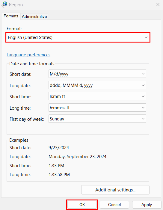 - Pengarahan kolom |Format| ke "English (United States)" > |OK|