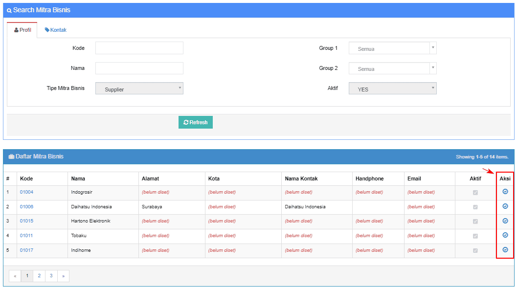 Muncul kotak dialog daftar supplier kemudian klik logo "Centang" pada kolom aksi untuk pilih supplier.