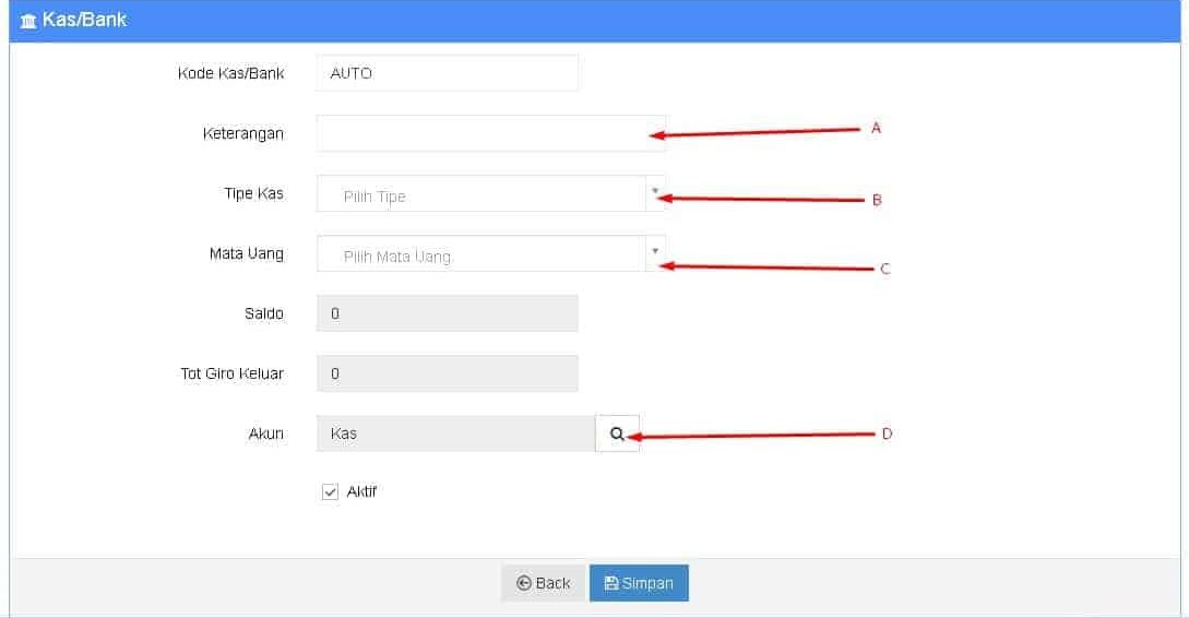 Master Kas/Bank adalah form untuk membuat data master Kas dan Bank. Pada BeeCloud ini Kas dan Bank merupakan master yang sama, perbedaan hanya pada Tipe atau jenisnya.