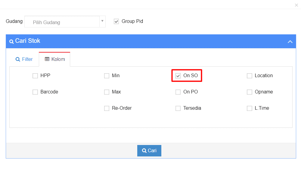 2. Kemudian klik |Filter / Search|> pilih tab |Kolom| > Lalu Checklist |ON SO| > Klik |Cari|.