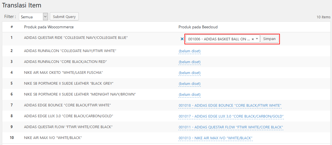 Disini fungsi menu Translasi Item untuk menyambungkan antara item WordPress anda dengan Beecloud, caranya klik Belum diset lalu isikan kode item di Beecloud anda nantinya akan muncul item yang anda pilih lalu klik simpan