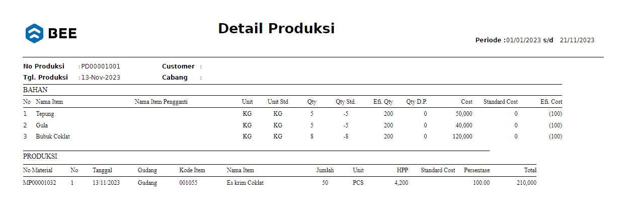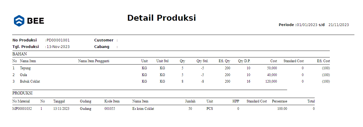 Berikut contoh dan penjelasan laporan detail produksi dari proses Produksi Manual :