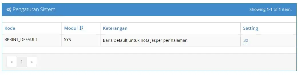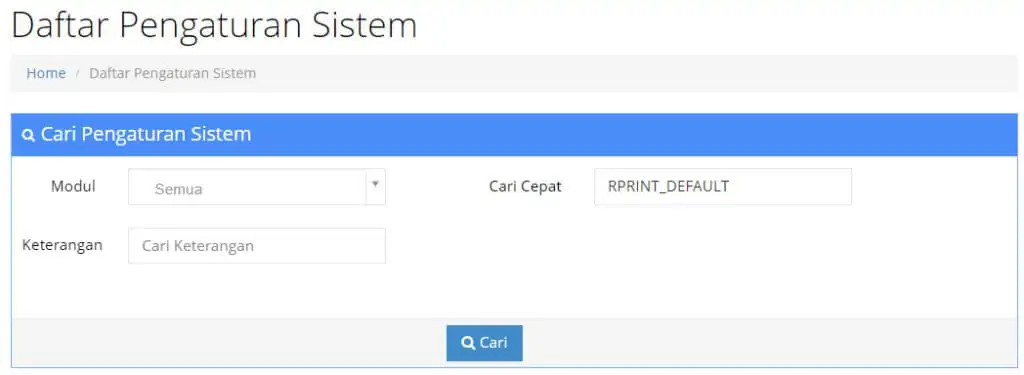 Masuk menu Sistem - Pengaturan Sistem. Pada kolom Cari Cepat, tuliskan RPRINT_DEFAULT, keudian klik Cari.