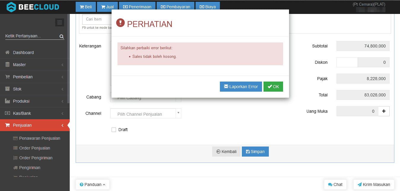4. Selanjutkan tes input penjualan tanpa input salesman, kemudian simpan, maka akan muncul warning seperti berikut