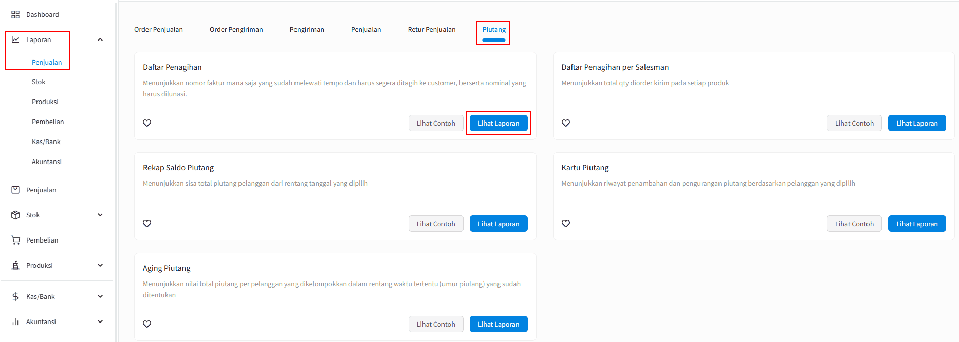 1. Masuk ke menu [Laporan] > [Penjualan] > pilih tab [Piutang] kemudian |Lihat Laporan| pada "Daftar Penagihan".