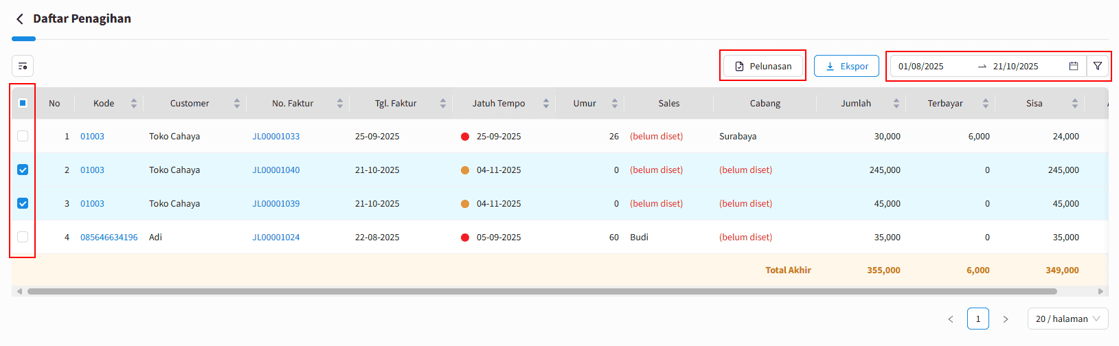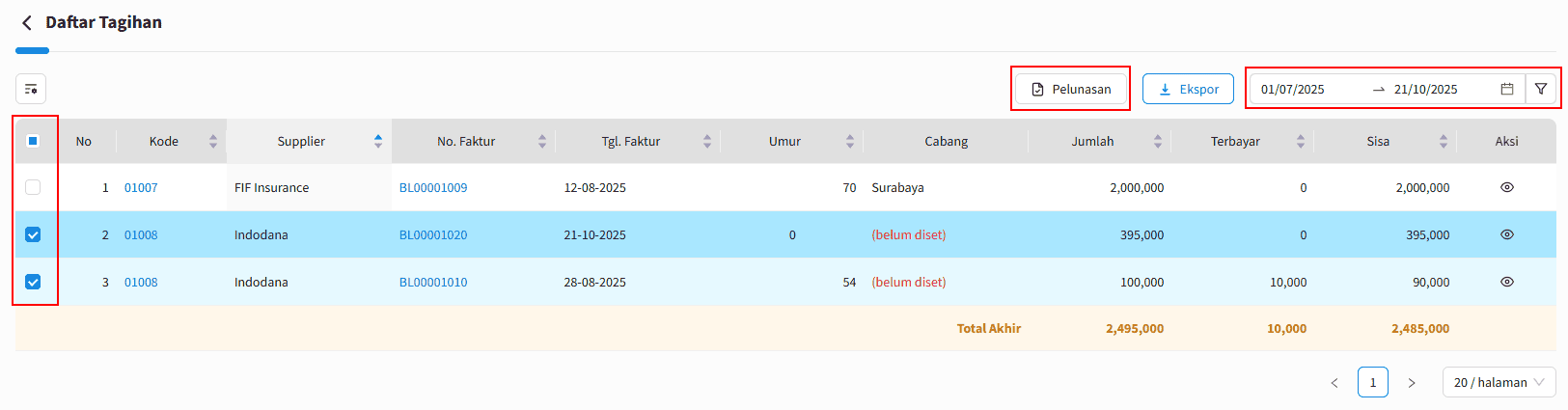 2. Sesuaikan filter periode dan filte lainnya sesuai kebutuhkan. Kemudian centang pada baris transaksi yang akan dibayarkan secara masal lalu klik |Pelunasan|.