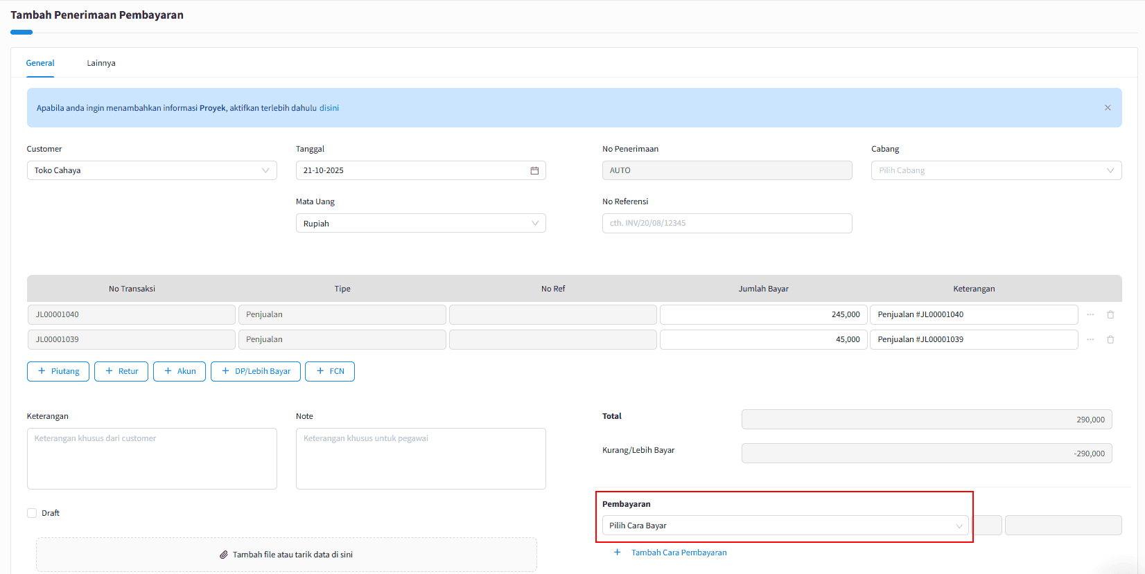 3. Berikutnya akan otomatis masuk ke halaman Tambah Penerimaan Pembayaran, kemudian silahkan pilih cara bayar yang digunakan kemudian |Simpan|.