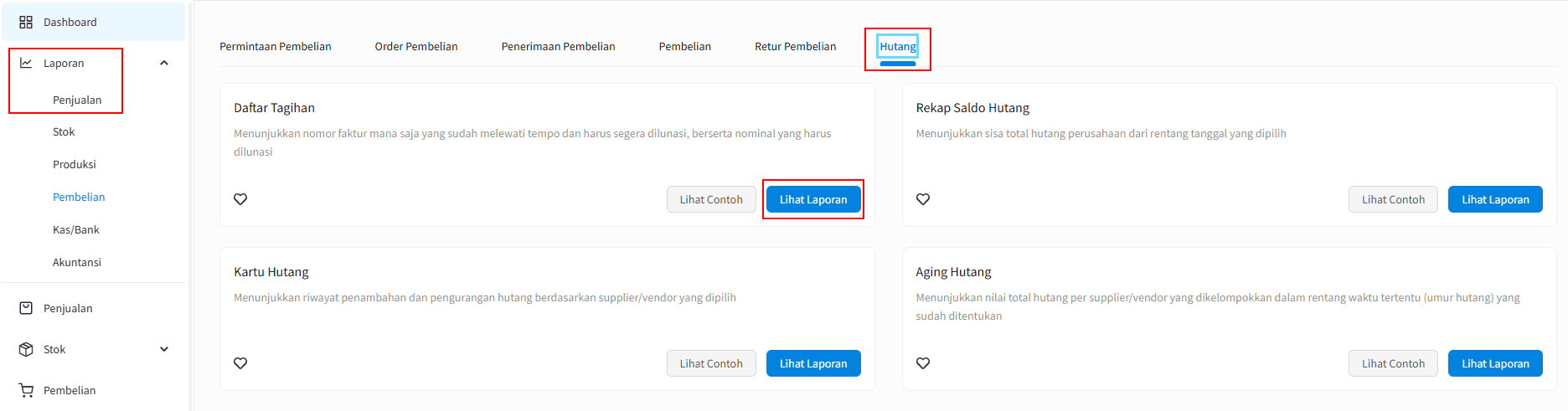 1. Masuk ke menu [Laporan] > [Pembelian] > pilih tab [Hutang] kemudian |Lihat Laporan| pada "Daftar Tagihan".