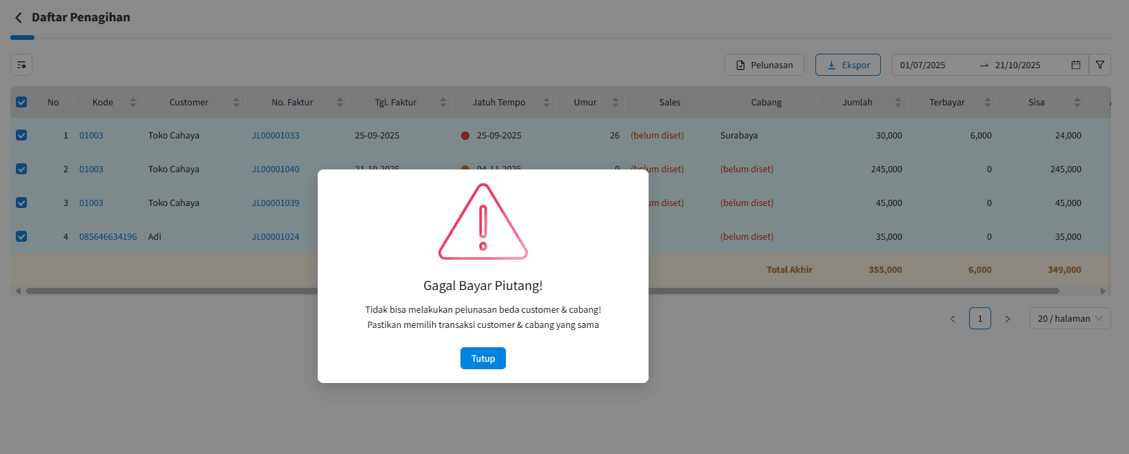 Jika nama customer/supplier atau cabang transaksi yang dipilih tidak sama, maka akan muncul pesan error seperti berikut.