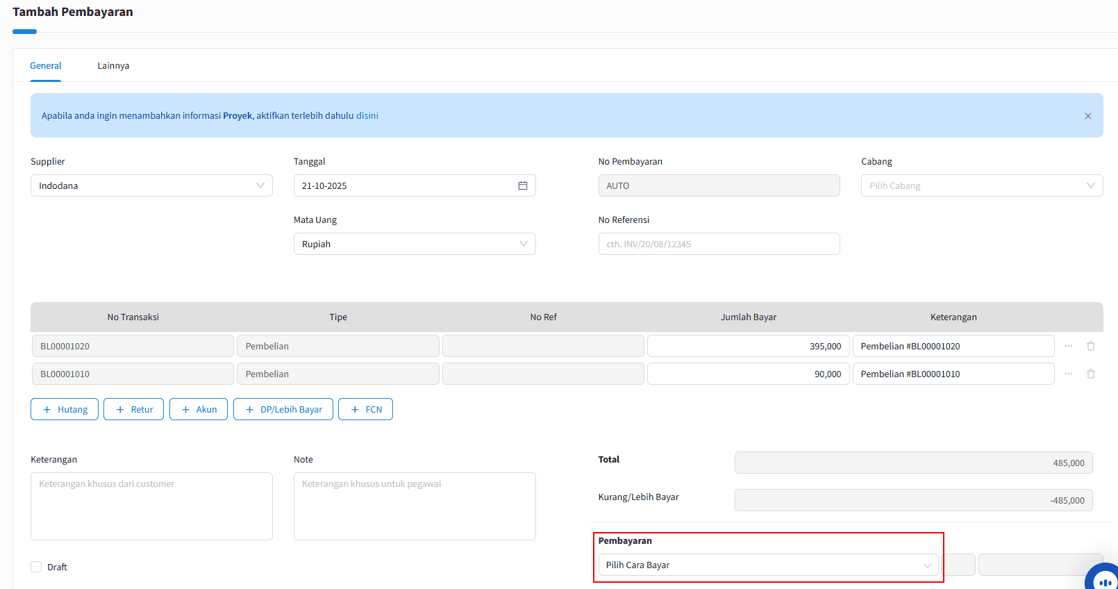 3. Berikutnya akan otomaris masuk ke halaman Tambah Pembayaran, kemudian silahkan pilih cara bayar yang digunakan lalu |Simpan|.