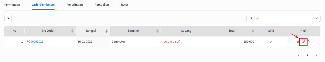 Klik logo pensil pada kolom aksi untuk edit transaksi order pembelian yang sudah diinputkan.