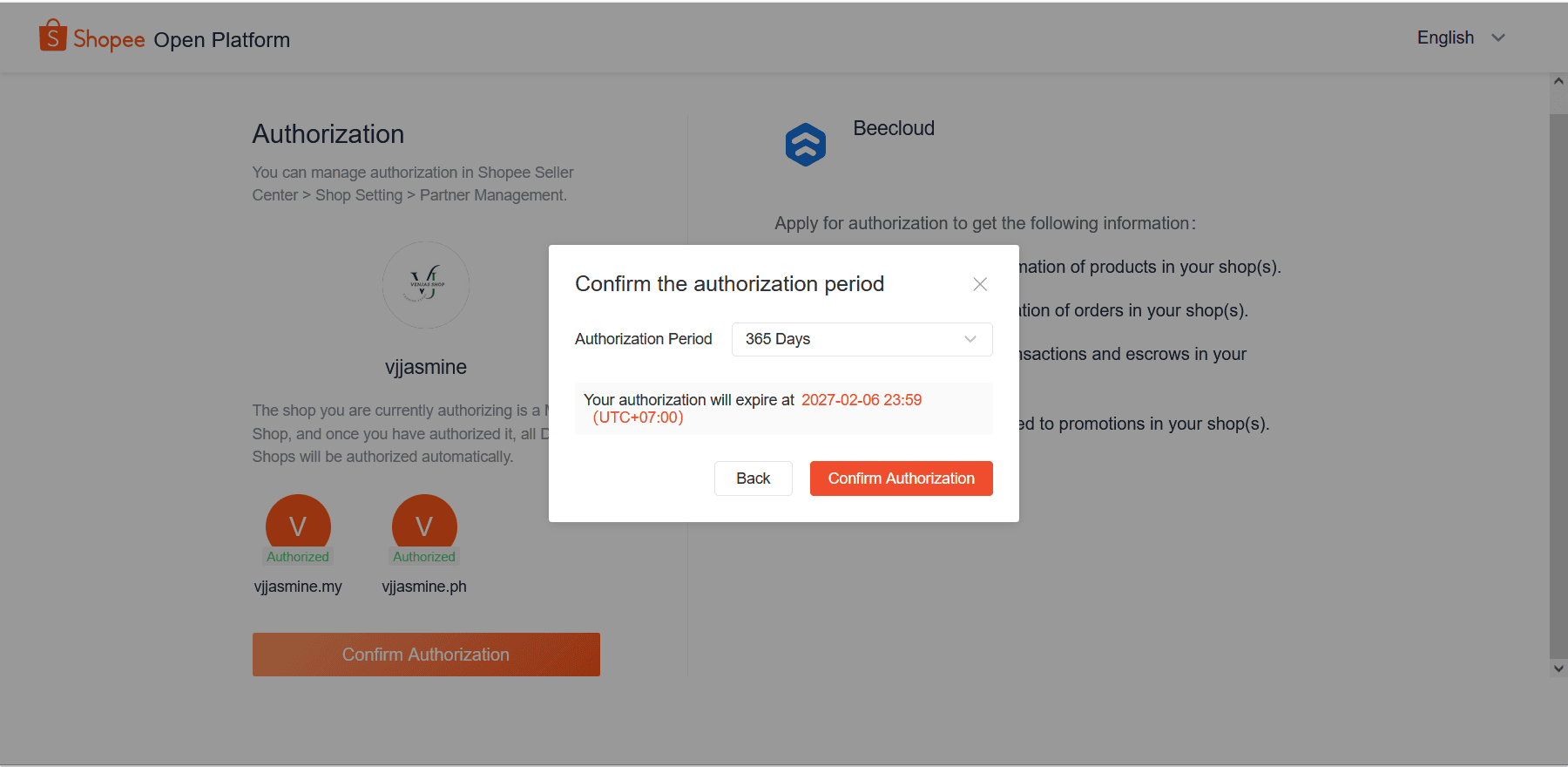 8. Jika muncul box Confirm the authorization (Shopee) pilih [365 Days] | [Confirm Authorization]