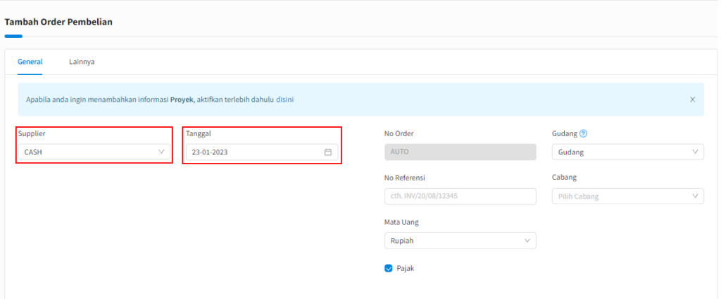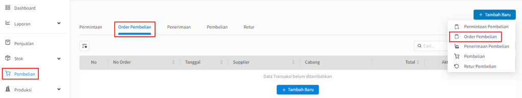 Pada panduan kali ini akan menjelaskan tentang cara membuat order pembelian berdasarkan dari permintaan barang. Yang mana detail order pembelian akan mengambil data atau diimpor dari permintaan barang [Stok] > [Permintaan Barang], sehingga tidak perlu inputkan detail order pembelian satu-persatu.