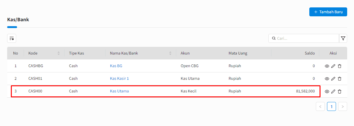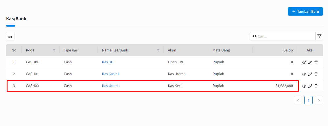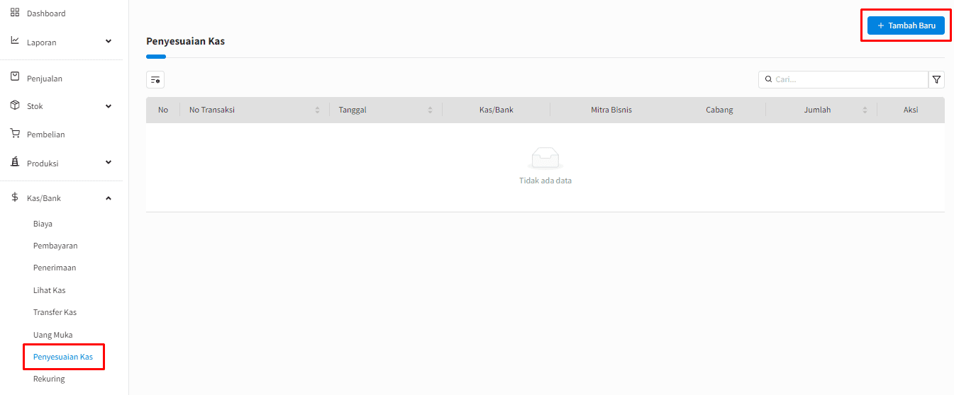 1. Masuk ke Menu [Kas/Bank] > [Penyesuaian Kas] > lalu pilih |Tambah Baru|.