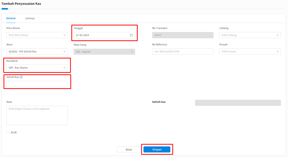 2. Sesuaikan tanggal dan pilih master kas/bank yang ingin disesuaikan, inputkan nominal saldo penyesuaian (inputkan selisihnya saja) kemudian klik |Simpan|.
