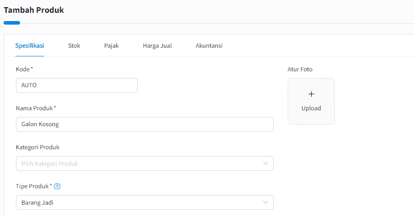 2. Selanjutnya Isikan pada tab spesifikasi Nama Item misal Galon Kosong dan jenisnya isikan barang jadi dan jangan lupa ganti Satuan
