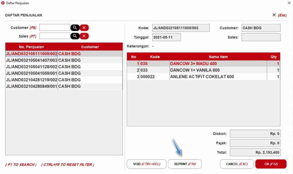 Klik transaksi yang ingin di print ulang, kemudian klik Reprint