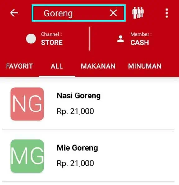 Klik menu yang dipesan/dicari, otomatis jika sudah terpilih maka tampilan item akan terblock merah.
