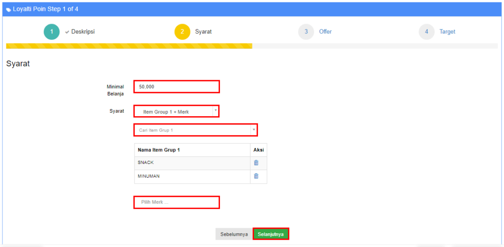 4. Pada langkah ini anda diminta untuk menentukan Offer yang akan di dapatkan oleh customer apabila sudah memenuhi syarat yang sudah anda buat sebelumnya (langkah nomor 3), Jika sudah selesai klik [Selanjutnya].