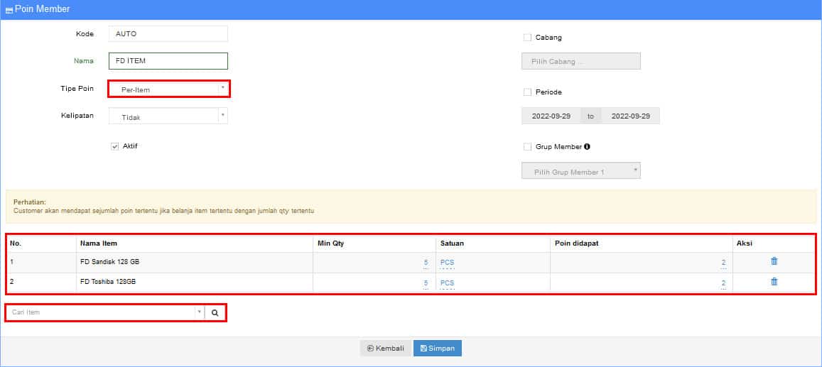Silahkan anda tentukan Grup item yang termasuk ke dalam syarat untuk mendapatkan Poin, anda juga bisa menggunakan Merk sebagai syarat, bahkan anda bisa menggunakan kombinasi Item Group dan Merk.